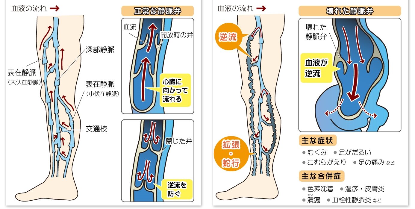 静脈には血液が下に落ちないようにする弁がありますが、これが弱ると血液が戻りやすくなり、血管に負担がかかって太く・曲がりくねって見えることがあります。