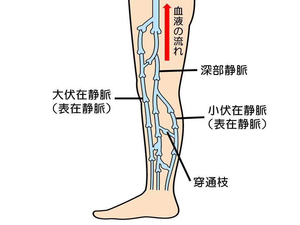 下肢静脈瘤は、静脈弁が壊れ、血液が逆流して足に滞る病気です。