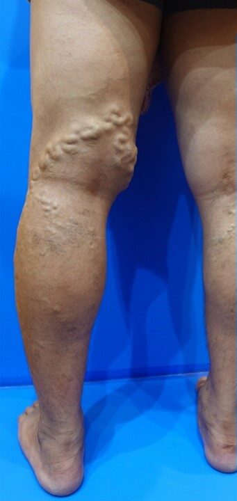 • 太ももの後面に太い静脈が蛇行し、大きく盛り上がっている